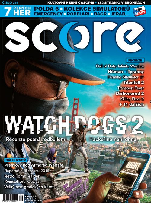 Jak se asi dalo čekat u posledního předvánočního čísla, časopis (má ještě cenu připomínat, že ho tvoří naditých 132 stran?) tentokrát tvoří především recenze. Je jich bezmála dvacet a najdete mezi nimi verdikty takových očekávaných hitů jakými je Watch Dogs 2, Dishonored 2, Call of Duty: Infinite Warfare, Titanfall 2, Hitman, Tyranny, Transport Fever nebo třeba Killing Floor 2. A když už jsme u těch simulátorů, tak jsme zrecenzovali taky Farming Simulator 17. Pro pamětníky opět máme čtyřstránkové Retro (tentokrát slavíme výročí s Larou Croft), znovu jsme si zahráli kultovní Star Wars střílečku Jedi Outcast, znovu jsme se vrátili do Mafie III (v Coopu i Dohře) a… a… no však to zjistěte sami a nové SCORE 274 si nenechte ujít. V prodeji je u všech dobrých prodejců tisku.
