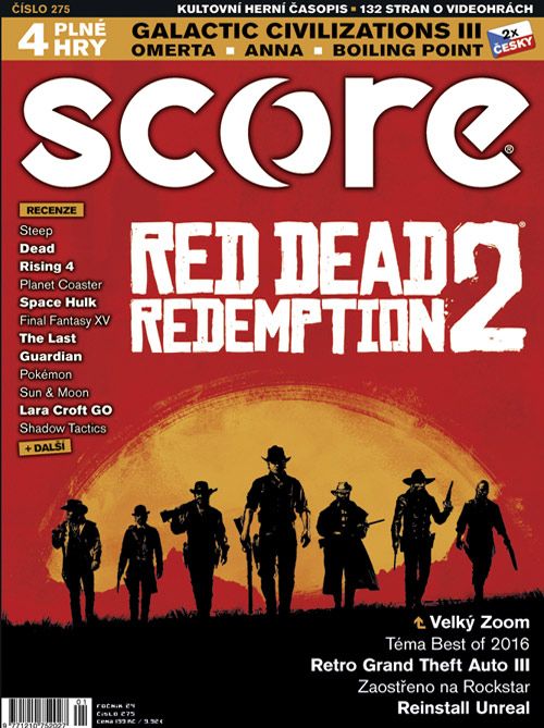 A co časák? Je to první číslo nového roku, takže nám odpusťte to bilancování. Zavzpomínali jsme na nejlepší hry roku 2016, a to v podobě dvaceti osobních zážitků. Na obálce vidíte Red Dead Redemption 2 a uvnitř si přečtete zajímavý Zoom – ano, oficiálních informací je pomálu, takže je to hodně o spekulacích, dohadech a taky našich přáních. Dočkáte se samozřejmě obvyklé dávky recenzí v čele s tituly Steep, Dead Rising 4, Planet Coaster, Batman: The Telltale Series, Final Fantasy XV nebo The Last Guardian. A přidáváme i klasické rubriky Retro a Reinstall, ale o Coop, Dohra a… no však už to znáte. Tohle všechno a ještě mnohem více vás čeká na 132 stranách 275. čísla SCORE. V prodeji je u všech dobrých prodejců tisku.