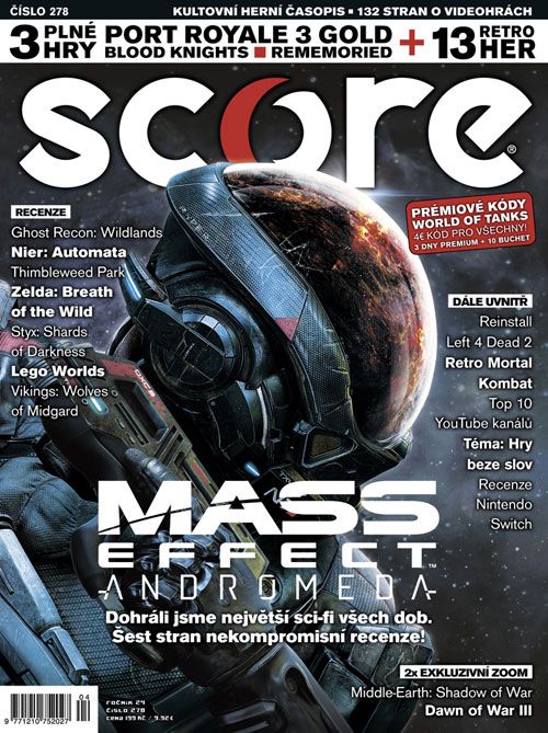 SCORE 278 už je v prodeji u všech dobrých prodejců tisku! Uvnitř najdete spoustu recenzí na velké tituly v čele s velkou šestistránkových recenzí Mass Effect Andromeda. Dále recenzujeme třeba Nier: Automata, Thimbleweed Park, Styx: Shards of Darkness, Lego Worlds nebo nové konzolovky 1-2-Switch, Yakuza a samozřejmě i Legend of Zelda: Breath of the Wild. V tématických článcích se zaměřujeme např. na cyklistický MMO simulátor, na hry beze slov nebo jsme vybrali deset nejzajímavějších YouTube kanálů a vynášíme verdikt nad novou konzolí Nintendo Switch. V Retru si přečtete o Game Boy Color nebo Mortal Kombatu, samozřejmě tu najdete i všechny další pravidelné rubriky. Na DVD najdete tentokrát tři plné hry – vedle Port Royale 3 Gold Edition je to Blood Knights a také Rememoried. Navrch máme ale ještě dva další bonusy – jednak retro kolekci Cinemaware Anthology: 1986-1991 (13 starých her z let 1986 až 1991) a pak prémiový kód pro World of Tanks v hodnotě 4 Eur (získáte tři dny prémiového účtu a deset buchet) a další pro nové hráče s ještě vyšší hodnotou. Utíkejte do trafik, SCORE 278 je právě v prodeji!