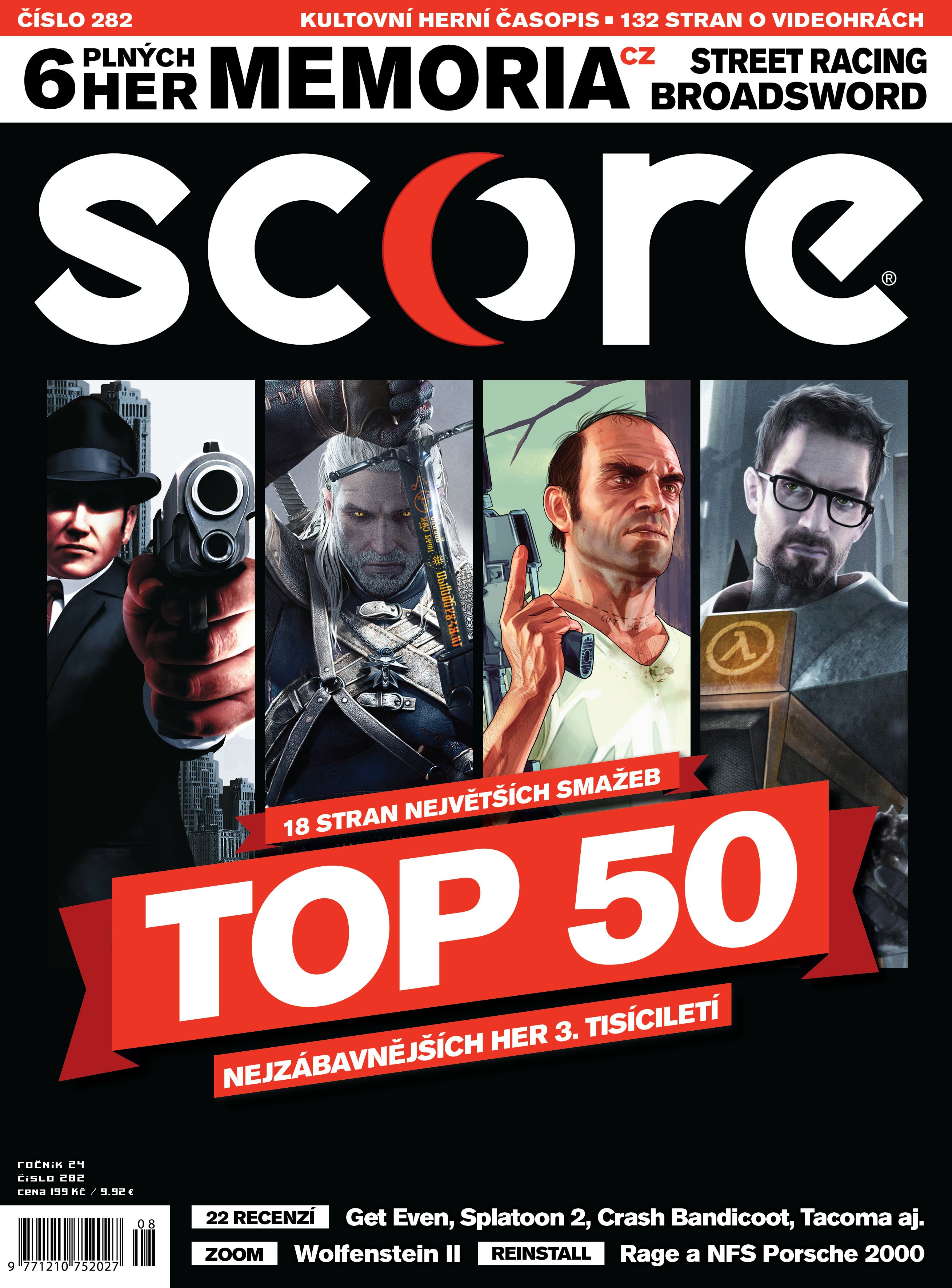 Jestli nám nějaký čas umožňuje trochu povolit uzdu fantazie, jsou to letní čísla, kdy nevychází mnoho nových hitů. Jasně, i v novém SCORE 282 najdete recenze všech aktuálních her v čele s Get Even, ovšem zásadní je tu hlavní 18stránkový článek – v redakci jsme vybrali TOP 50 nejlepších her a pořádně si na ně zavzpomínali. Žádné retro, žádná nostalgie, žádné umístění za zásluhy, jen ty nejlepší hry, které si můžete zahrát tady a teď. Tak co, tipnete si vítěze? Co jsme přehodnotili? A na co jsme trestuhodně zapomněli? Třeba s námi budete souhlasit, ale třeba také ne. Kromě toho na 132 stránkách najdete i velký Zoom nového Wolfensteina, kterého jsme hráli tři hodiny na prezentaci v Londýně včetně obsahu, který nebyl na E3 dostupný. A pak samozřejme ještě mnohem více – ve SCORE 282 vás čeká 132 stran parádního čtení a na placce najdete šest plných her (čtyři z toho v češtině!) včetně fantastické adventury Memoria. SCORE 282 bude v prodeji od pátku 11.8.!