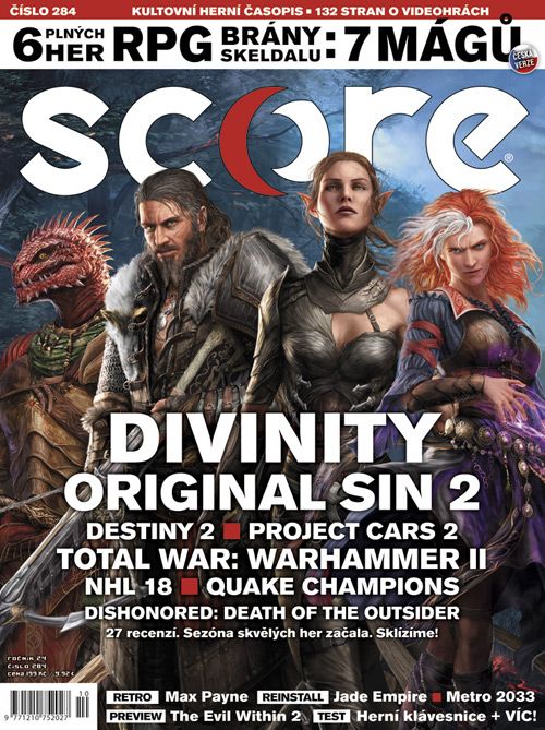 Divinity: Original Sin 2, Destiny 2, Project Cars 2, Quake Champions, NHL 18, Dishonored: Deasth of the Outsider, Absolver nebo třeba Vaporum. To jsou některé z 27 recenzí, které najdete ve SCORE 284. A tentokrát bylo co chválit, urodilo se nám hned několik devadesátek a dalších pár her na tuto hranici smutně pokukuje z malé vzdálenosti. Uvnitř najdete i všechny své oblíbené rubriky a také nezbytné informace o chystaných hrách v čele se Zoomem The Evil Within 2, který jsme si zahráli. Pamětníky zase jistě potěší retro vzpomínka na Max Payne, případně dvojice reinstallů Jade Empire a Metro 2033. Čtení na těch hustě popsaných 132 stranách najdete jako obvykle mnohem více, takže se pojďme podívat na plné hry. Je jich šest, v čele s trilogií Brány Skeldalu. Tohle kultovní české RPG vás určitě zaujme hlavně díky skvělému třetímu dílu, který vloni vyšel a který si teď můžete se SCORE zahrát v kompletní české lokalizaci. Nové SCORE 284 je v prodeji všude tam, kde se prodávají kvalitní časopisy! Nenechte si ho ujít.